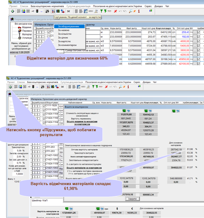 3. Для аналізу цін на матеріальні ресурси, сумарна вартість яких становить 60 відсотків загальної вартості всіх матеріальних ресурсів, скористуйтеся режимом «Розрахунок поточних цін». Натисніть кнопку «Сортування», та оберіть режим «За вартістю».
